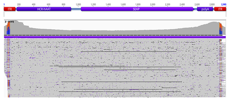 Coverage plots show sequencing read distribution across the ITR-to-ITR region, including promoter, transgene, and regulatory elements, as well as nucleotide polymorphisms. Uniform coverage supports intact genome representation, while localized drops or discontinuities may indicate structural abnormalities detectable through NGS.