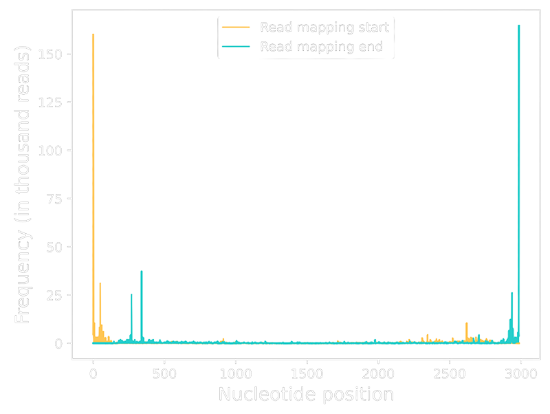 Sequence length distribution reveals the proportion of full-length vector genomes relative to shorter fragments, enabling detection of truncations and structural heterogeneity. The dominant peak corresponding to the expected genome size indicates intact packaging, while absence of secondary peaks supports minimal truncated species. Optionally, read size profiles can be corrected for Oxford Nanopore sequencing size bias with co-sequenced lambda phage DNA digest.