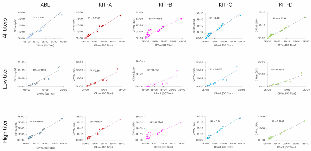 The ABL kit features a cost-effective and convenient protocol with high sensitivity (3–100 pg/mL), requiring minimal sample volume and providing results in under three hours. Unlike recombinant methods, its natural component design ensures high specificity and low variability in crude or low-titer samples. Key findings include strong correlation coefficients (R²), favorable viral particle (VP) ratios (i.e. VP -p24/VP-GC) and low coefficients of variation (CV%), underscoring the kit’s robustness across all process stages.